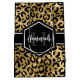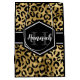 Bolsa de presente de ouro e leopardo preto com nome personalizado e modelo de monograma. Um padrão de impressão animal de safari giro e tendencioso veio com seu próprio pedaço de personalização.