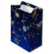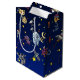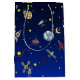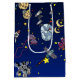 Moon Adventure Gift Bag - Ilustrações do estilo de desenho animado de todos os tipos de coisas que você pode encontrar no espaço - foguetes, OVNIs, satélites, estrelas, planetas, lua e terra. Veja seus olhos de explorador espacial se acendem quando eles veem seu presente embrulhado nesta adorável bolsa de presentes de lua.