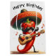 Uma pimenta vermelha antropomórfica vestindo um grande bigão e bigode preto enquanto apertava um violão. O texto pode ser alterado.