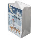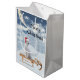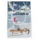 White Poodle sai em um trenó na neve vestindo um cachorro de chapéu vermelho de Papai Noel ama um presente de Natal