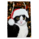 O gato preto e branco do gatinho do smoking veste um chapéu do papai noel na frente do saco do presente de época natalícia dos amantes do gato da árvore de Natal