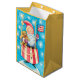 Esta bolsa de presente de Férias apresenta uma maravilhosa imagem de vintage de um Pai Natal que está vestido com um roupão vermelho, branco e azul. Ele está segurando uma bandeira de Stars and Stripes EUA em uma mão, e um ursinho de pelúcia com um arco vermelho na outra. Atrás dele está uma estrela azul bonito que derramou o céu. Os lados da bolsa são dourados brilhantes. Ambos os lados da bolsa têm a mesma imagem. Para centenas de imagens de Natal e contemporâneas em uma variedade de produtos, veja a seção "Natal" em nossa loja.