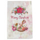 Um saco festivo de presente de Natal. O fundo é uma colagem de estilo vintage com uma imagem esmaecida de rosas rosa, folhas verdes e escrevendo francês. Camadas sobre o topo está um bonito buquê de natal de poinsettia e um cavalo de balanço vitoriano cercado de peônias e posições rosa bonito. O texto diz "Feliz Natal".
