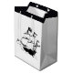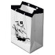 Saco branco médio de presente com desenho, na frente e atrás, de um navio pirata voando num Jolly Roger. Limite superior preto. Ver o pacote de presentes, o convite, o envelope, o confetti, a bolsa de favor, a etiqueta de favor, a etiqueta, o adesivo quadrado e o papel de embalagem. Veja a coleção inteira de Gift Bag de Naufrágio nos TOUCHES ESPECIAIS| Seção Favoritos para festas.