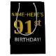 Este simples design de bolsa de presente de aniversário apresenta uma mensagem personalizada como "NAME-HERE'S 91rua BIRTHDAY!" (com a "91ruas" a ter um visual falsa/imitado de cor dourada) sobre um fundo de cor preta. O nome está em texto em negrito de cor amarela e pode ser personalizado. Uma bolsa de presente de aniversário personalizada como esta poderia talvez ser usada quando se dá um presente a alguém que comemora o seu 90º aniversário. [~Z0000252]