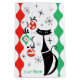 Médio do século design com um toque retrorreflector com gatos pretos do estilo atômico, bolas de Natal verdes e vermelhas e estrelas pretas em um fundo com padrão vermelho, verde e branco. Um design personalizável para você personalizar com seu próprio texto, imagens e ideias. Uma imagem de arte digital original criada por Jess Perry no QuirkyChic Retro.