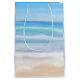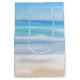 Saco do Presente de Partido de Médio Tamanho impresso com Ondas Reproduzíveis em Um Dia Sunny Na Praia pelo TheFabricSeal | Zazzle é um design de trabalho de arte midiático mestiço de cor d'água com vistas maravilhosas do céu azul claro e ondas lúdicas do oceano de azul-turquesa e verde chegando a praia arenosa.
