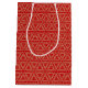 Saco de presente festivo vermelho e dourado com padrão geométrico triangular. Excelente para festas de Natal e feriados.