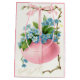 Um enorme ovo rosa de Páscoa com flores azuis minúsculas está pendurado por uma fita rosa e fina. Mensagem: Saudações Páscoas. Imagem de um Cartão-postal de Páscoa Vintage com um fundo de rosa claro personalizado.