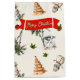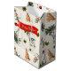 Saco de presentes de tamanho médio de Natal de praia com texto de saudação personalizado na frente. Saco de cor Ecru / esbranquiçado, com um padrão de palmeiras e praia, árvores de Natal e bonecos de neve. Cada folha tem um padrão de tamanho diferente, e uma folha tem um banner vermelho para manter sua escolha de saudação. O texto de exemplo é "Seas and Saudações", ou mude-o para Feliz Natal, Saudações Seasons, ou Feriados Felizes. O design transfere bem para o saco de presentes menor também.