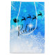 Saco de presente de Natal com uma silhueta preta de Papais noeis cavalgando em sua trenó sendo puxado por sua rena voando pelo céu. Acredite que está escrito em uma fonte de script de tendência. O fundo é um design de floco de neve gelado azul gelado. Personalize com uma saudação de Natal e um nome.