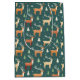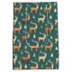 Papais noeis de renas se alinham contra um fundo verde-negro, entrelaçado entre algumas árvores de Natal simples. Simples, mas sazonal, este é um saco de presentes divertido e colorido para crianças de todas as idades.