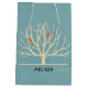 Um saco-presente com um fundo verde-mudo sobre o topo é uma árvore amarela clara com duas silhuetas de pássaros laranja sentados nos galhos. Personalizar com um nome ou outro texto.