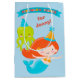 Este é um saco colorido do presente de aniversário para os miúdos que você pode personalizar com um nome na parte dianteira. Caracteriza uma sereia de cabelo alaranjada bonito e um polvo brilhante do verde limão, ambos os chapéus vestindo-se do aniversário. Na parte superior é uma bandeira azul com os peixes do aniversário do texto no ouro e no rosa. O texto e as imagens são colocados em uma luz - fundo azul. A parte traseira das imagens adicionais do saco de um peixe azul que guardara um balão vermelho, e uma baleia azul adorável. Maravilhoso para o aniversário de uma menina! a arte do *Clip usada neste design é com direitos de autor por Encore Software, Inc., que permite o uso a seus concessores. Todos os direitos reservados.