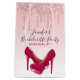 Um design moderno e trendy em sacolas de presentes para festa de despedida de solteira. O fundo tem uma imagem de pingos de brilho rosa cintilante, ao longo da parte superior. O restante do fundo é um gradiente de cor rosa pastel delicado. Um par de sapatos de salto alto rosa abaixo do texto personalizado.