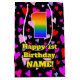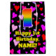 Esta design de bolsa de presente colorida e divertida de aniversário apresenta um grande número "1" tendo um padrão inspirado no gradiente do espectro arco-íris. Ele também apresenta a mensagem "primeiro aniversario feliz" e um nome personalizado. O fundo apresenta um padrão de formas cardíacas com cores como roxo, vermelho e rosa. Um presente de aniversário feliz como este pode ser usado quando se dá um presente ou presente em comemoração do primeiro aniversário de alguém. [~Z0000551]