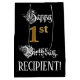 Este design de presente de aniversário opulente e luxuoso apresenta a mensagem "primeiro aniversario feliz", juntamente com um nome de destinatário personalizado. Parte da mensagem está em um texto estilo script de ornamentado, o grande número "1rua" apresenta um padrão de aparência falsa/imitado de inspiração dourada, e o fundo é preto colorido. Uma bolsa de presente temida de aniversário elegante como esta pode ser uma forma respeitável de embrulhar um presente ou presente para celebrar o primeiro aniversário de alguém. [~Z0000560]