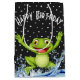 Sapo verde feliz saltando da água azul no padrão de bolinhas branca e fundo preto.