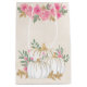 Saco de presente com abóboras brancas de rico aquoso com acentos de brilho sujo. Cercados por folhas verdes e flores rosas selvagens.