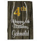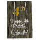 Este elegante, na moda, e luxuoso aniversário, com o tema giftbag design, apresenta um grande número ordinal "4º", com uma imitação/aparência falsa de ouro, juntamente com a mensagem de saudação de aniversário "Feliz 4º Aniversário", e um nome de destinatário personalizado numa letra estilo script. O fundo tem um padrão falsa inspirado em madeira. Um presente de aniversário sofisticado como este pode ser uma maneira divertida de embrulhar um presente ou presente para celebrar o 4º aniversário de alguém. [~Z0000520]