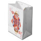 Saco branco médio brilhante com a imagem de um cartão de jogo da Rainha do Coração. Veja como combinar um grande saco de presentes, convite, confetti, bolsa de favor, caixa de favor, etiqueta de presente, etiqueta e papel de embalagem. Veja toda a coleção Wonderland Gift Bag nos TOUCHES ESPECIAIS | Seção Favoritos para festas.
