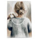 Uma jovem de cabelo louro amarrada num pão segura um coelho branco liso e com orelha-seca sobre o ombro, criando uma cena tenra e serena. O texto pode ser alterado.