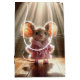 Um rato giro se posiciona sobre um chão de madeira vestindo um manto rosa e pantufas iluminadas por raios solares no aniversário. O texto pode ser alterado.