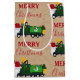 Uma bela ilustração de um caminhão de lixo de reciclagem de Natal vestindo um chapéu de Papai Noel e decorado em luzes de Natal com palavras "Feliz Natal" e papel kraft marrom parecem fundo. Um saco de presente de Natal ideal para entusiastas de caminhão de lixo grandes ou pequenos, meninas ou meninos.