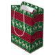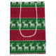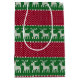 A playful faux-knit design featuring rows of white reindeer marching across festive red and green stripes. Classic Christmas sweater style for cozy cheer.