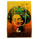 Minha Design apresenta um retrato estilizado de uma linda mulher africana vestindo um manto colorido. A capa é enfeitada com padrões de folhas verdes e amarelas. Seu rosto está cheio de uma silhueta por sol, cheia de pássaros voando pelo céu e uma paisagem com árvores. Ela veste brincos grandes e ornamentados e um colar com a bainha. Estilo de Arte Pop original Ilustração vetorial Copyright BluedarkArt The ChameleonArt.