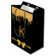 Um saco de favor para um chá de bebê ou chá de noiva feminino e glamoroso. Fundo preto decorado com gotas de brilho dourado falso, com efeito de pintura pingando. Personalize e adicione seu nome e letra de monograma. O nome é escrito com um estilo de letra manuscrita trendy com floreios. Para manter os floreios, exclua o nome da amostra, deixando os espaços ou emojis antes e depois do nome.