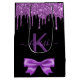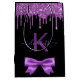 Um saco de favor para uma festa de aniversário glamorosa e feminina, chá de noiva ou chá de bebê. Fundo preto decorado com gotas de brilho falso roxo, visual de tinta pingando e um laço. Com o texto: Obrigado! Personalize e adicione seu nome. O nome é escrito com um estilo de letra manuscrita trendy com floreios. Para manter os floreios, apenas exclua o nome da amostra, deixe os espaços ou emojis antes e depois do nome.