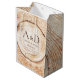 Adicione um charme rústico à sua celebração de casamento com esta bolsa de presente personalizada com fatia de madeira e monograma para lembranças de casamento. Inspirada nos anéis naturais das árvores e texturas da floresta, este design apresenta um padrão de textura de madeira rústica com um monograma personalizado do casal, nomes e data do casamento centralizados dentro de um motivo de fatia de árvore.