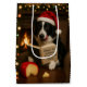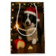 Saco de presente de Natal concebido individualmente, com uma "Border Collie" a preto e branco, lendo um livro intitulado "Cheese Tax at Home Regulations 2025". Todos sabemos que o imposto sobre o queijo tem de ser pago - as regras são regras!