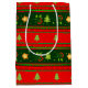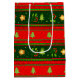 Apresente seus presentes em estilo! Perfeito para presentes festivos, este Saco de Presente Médio, com grandes listras horizontais vermelhas e verdes, embelezado com árvores de Natal verdes, flores vermelhas com folhas verdes e estrelas de ouro bonitinho, vai adicionar uma explosão de cor ao seu presente. Esta é uma forma excelente de apresentar qualquer surpresa especial neste Natal!