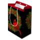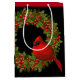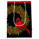 Esta bolsa de presente de Natal é mostrada a preto com uma coroa vermelha e uma coroa festiva e impressão de arte de pássaros cardeal. Personalize este item ou comprar como está.