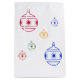 Ornamentos redondos para árvores de férias, dois grandes e quatro pequenos, em cada lado. Cores de globos individuais são azuis, verdes, vermelhos, laranja.