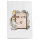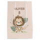 This medium-sized bag features the serene safari scene with friendly jungle animals in muted greens, beiges, and grays that match the party's coordinated theme. The personalized "Oliver" and "5" make it a special keepsake that builds anticipation for the gift inside.