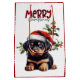 A imagem na frente e no verso desta bolsa de presente de Natal é de um adorável cachorrinho Rottweiler vestindo um chapéu de Papai Noel vermelho e branco. Atrás dele está um sorvedouro de bagas sagradas e vermelhas. O texto da xadrez de búfalos vermelho e preto estilizado diz MERRY CHRISTMAS". Certifique-se de ver os produtos correspondentes, incluindo etiquetas de presentes, em nossa loja.