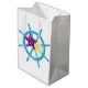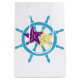 Blue shipwheel with a yellow and purple starfish for a cute nautical vibe.