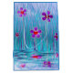 Um desenho digital de lindas flores roxas estilizadas com centros vermelhos brilhantes. Estão a espreitar-vos com instabilidade a partir da erva alta ao lado de uma piscina de água ripada.