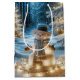 Um bonitão vestindo um cachecol e um chapéu em uma floresta nevada cercado por árvores iluminadas com luzes de Natal. O texto no verso pode ser alterado ou excluído.