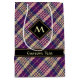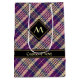 Design púrpura, ouro amarelo e tartã azul. Um padrão perfeito. Texto personalizado e monograma.