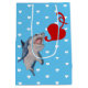 Namorados Shark Medium Gift Bag, apresentando um tubarão azul percorrendo um gancho vermelho, fundo azul com pequenos corações brancos.
