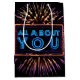 Sinal de neon "All About You" brilhante com fogos de artifício a preto para o aniversário