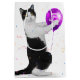 Gato preto e branco com balão roxo e confete em fundo branco para 7. A cor branca do fundo pode ser alterada.