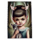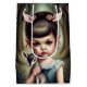Perdido num mundo de imaginação e amor. Uma jovem está segurando um veado em seus braços. A garota está vestindo um vestido azul e tem um par de chifres na cabeça. A cena está em uma floresta, com árvores ao redor da menina e do veado