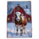 Saco de presente sazonal em estilo country de Natal, com ilustração de uma vaca festiva num chapéu de Papai Noel, em frente a um lindo celeiro vermelho, decorado em luzes de Natal e uma coroa festiva num dia de inverno de neve. O fundo é uma madeira de fundo ou de celeiro rústico.