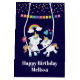 Saco de presente de aniversário com 2 unicórnios dançantes fofos com caudas e crinas brilhantes e coloridas. Um arco-íris colorido com nuvens de cada lado acima de suas cabeças. Outros elementos incluem uma pequena flor, um coração e algumas estrelas. Fundo roxo escuro. Pontos de confete coloridos e uma imagem de uma bandeira de festa ao longo da parte superior.