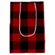 Urso de pelúcia castanho enredado em luzes de Natal em fundo de xadrez de búfalo vermelho e preto. O texto é editável.